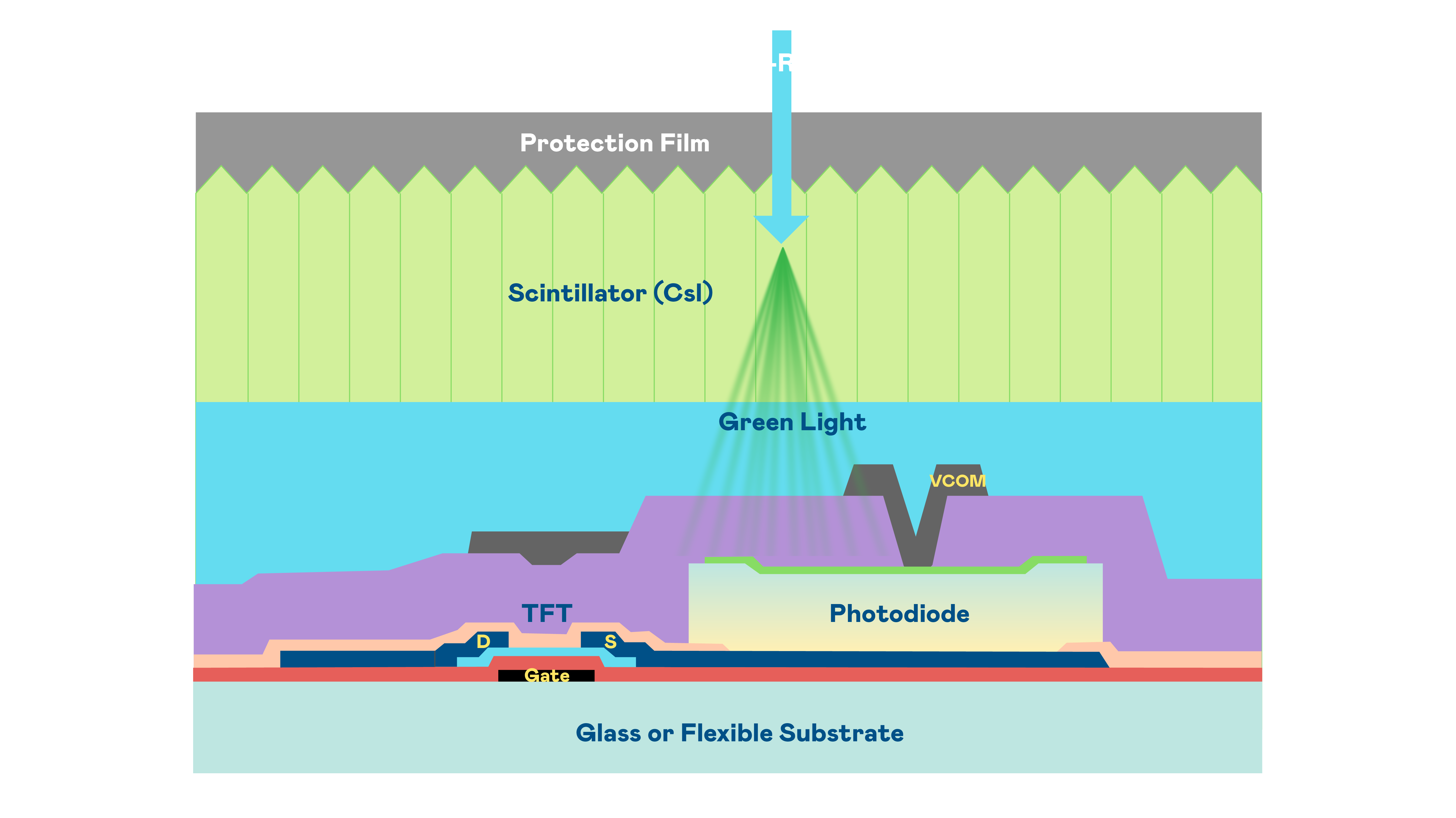 非凡游戏的X光影像感测阵列使用薄膜电晶体 (TFT) 作为每个像素的读取开关,搭配光电二极体(Photodiode)的光电转换元件,用以感测X光影像讯号。
